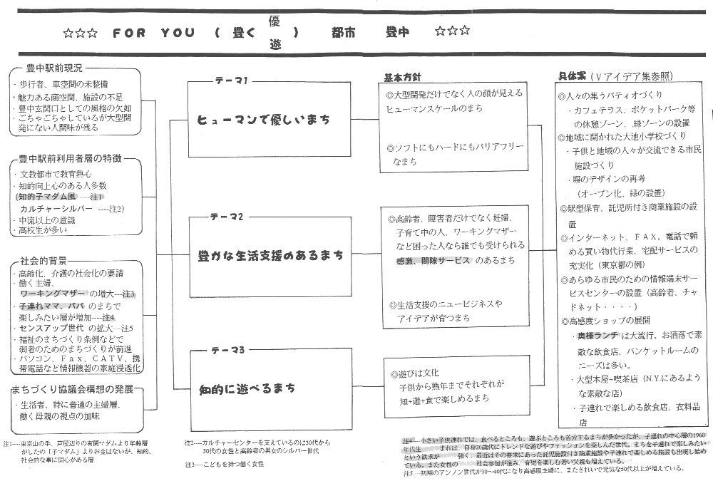 あなたのための(FOR YOU、 豊優、 豊遊)都市に豊中がなって欲しいという願いこめて、 基本方針、 具体案をあわせて次ページ以降に提案していきたいと思います。