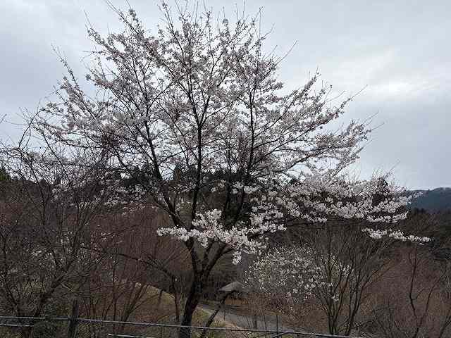 春になり、山の家ではやっと桜がきれいに咲き始めました。 食堂前の桜です。 他には、コブシやモクレンが、きれいな白色の花をつけています。