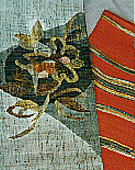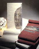| 独自の技法で糸をひいた〈真綿〉を紡いで、ざっくりとした感じに織りあげたものと、平巻糸を緯糸にした〈上代〉とがあります。どちらも野趣に富んだ温か味のある風合いが魅力です。体の動きにつれて伸縮しますから、締めごこちの良い実用的な帯です。紬、小紋等のおしゃれ着向きの、渋好みの組合わせとして人気があります。 |