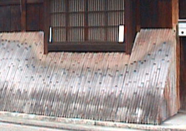 | 店の表ではないところに設けられている出格子。いわゆる出窓で、あまり強度はない。屋根は銅板葺き。格子の種類もいくつかある。 |