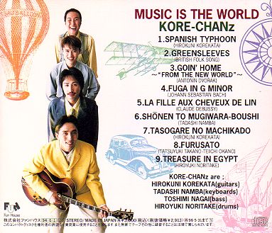 1994年 「音楽は世界だ!」(KORE-CHANz) (ファンハウス) 1.SPANISH TYPHOON 2.GREENSLEEVES 3.GOIN’ HOME 4.FUGA IN MINOR 5.LA FILLE AUX CHEVEUX DE LIN 6.SHONEN TO MUGIWARA−BOUSHI 7.TASOGARE NO MACHIKADO 8.FURUSATO 9.TREASURE IN EGYPT |
