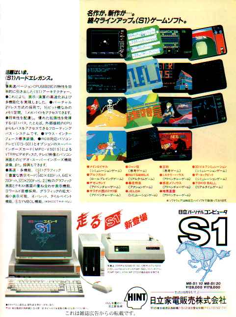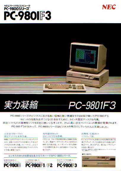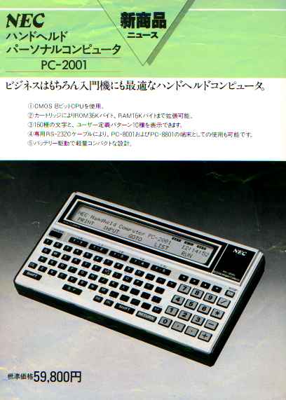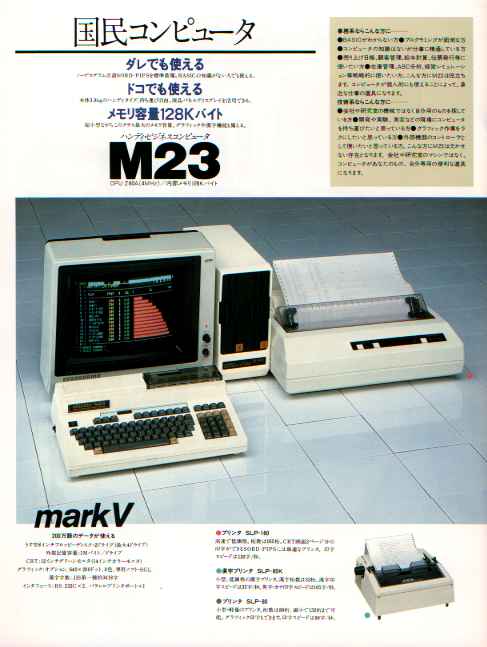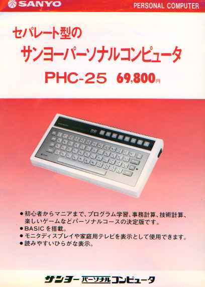 YEAR PRODUCT COMPANY COMMENT 1976 TK80 NEC 日本のマイコンブームの起爆剤 1977 PET2001 COMMODORE APPLE2,TRS80と並ぶ初期の名機 1977 TRS80 TANDY APPLE2,PETと並ぶ初期の名機 1977? TK80E NEC TK80のエコノミータイプ 1977? LKit16 パナファコム マイコンキット 1977? H68TR 日立 マイコンキット 1978 TK80-BS NEC TK80&機能拡張システム 1978 COMPO-BS80 NEC TK80をケースに入れBASIC搭載 1978 MZ80K SHARP セミキット 1978 EX80 TOSHIBA マイコンキット 1979 MZ80C SHARP MZ80の完成品 1979 PC8001 NEC 25万台以上売れた当時の大ヒット機 1979 BASIC MASTER L 2 HITACHI 国産完成機のはしりの1つ 1980 APPLE ][J-plus Apple Apple][の日本版(東レ) 1980 MZ80K2 SHARP MZ80Kの後継機? 1980 VIC1001 COMMODORE 10万円を切ったホビー機 1980 FX9000P CASIO CMOS-RAMパッケージ 1980 Basic Master L3 HITACHI 6809搭載ビジネス機 1981 シンクレアZX81 sinclair 超廉価機 1981 M23 mark V SORD 日本語マルチコンピュータ 1981 PC8801 NEC 8001後継のビジネス機 1981 PC6001 NEC PSGなどを積んだホビー機 1981 MZ80B SHARP 64KRAM搭載クリーンコンピュータ 1981 MZ80K2E SHARP K2の廉価版 1981 MZ2000 SHARP MZ80Bの後継機 1981 バブコム80 システムズフォーミュレート FM8似のCP/Mマシン 1981 FM8 FUJITSU 富士通が満を持して発売したパソコン 1981 BASIC MASTER JR HITACHI L2の後継機種 1981 MULTI16 MITSUBISI 16ビット機のはしり 1981 JR100 MATSUSHITA 松下の低価格ホビー機 1981 IF800/30 OKI 8bitオールインワン 1982 N5200/05 NEC 16bitビジネス機 1982 PC9801 NEC 初代98! 1982 PC2001 NEC ハンドヘルド機 1982 MZ700 SHARP MZ80K系の後継機 1982 FM7 FUJITSU FM8の後継ホビー機 1982 FM11EX FUJITSU FM8の後継ビジネス機 1982 MZ1200 SHARP MZ80K/Cの後継機 1982 MZ3500 SHARP マルチCPUビジネス機 1982 X1 SHARP パソコンテレビ 1982 Basic Master L3mk2 HITACHI ステップ&漢字 1982 MB16001 HITACHI 日立の16ビット機 1982 PASOPIA TOSHIBA 東芝のパソコン 1982 PASOPIA MINI TOSHIBA 8ビットポケコン 1982 MY BRAIN 3000 MATSUSHITA 松下のMSDOSマシン 1982 JR200 MATSUSHITA 松下のJR100の後継機種 1982 HC20 EPSON ハンドヘルド機のはしり 1982 SMC70 SONY 16色表示、元祖3.5FD(シャッターが手動) 1982 FP1100 CASIO BCD演算で正確!でも遅い! 1982 ぴゅう太 TOMY 日本語BASIC搭載ゲームパソコン 1982 COMMODORE64 COMMODORE 世界のベストセラーでも日本では? 1982 PHC-25 SANYO 実売されているのを見たことがない 1982 PHC-8000 SANYO ハンドヘルド機 1983 PC9801F1/2 NEC FD搭載98 1983 PC9801E NEC 拡張性重視の98 1983 PC100 NEC 京セラのOEM機、先進のマシン! 1983 PC8201 NEC 京セラのOEM機、ハンドヘルド 1983 PC8001MK2 NEC PC8001直系の後継機種 1983 PC6601 NEC PC6001MK2にFD搭載 1983 PC6001MK2 NEC PC6001の後継、しゃべる! 1983 MZ5500 SHARP SHARPの16ビット機 1983 MZ2200 SHARP モニタなしのMZ2000 1983 X1C/D SHARP X1の後継機 1983 PC5000 SHARP 16ビットポータブル 1983 FP3000 CASIO 16ビット機 1983 IF800/50 OKI 16bitオールインワン 1983 BASIC MASTER L3MK5 HITACHI キャラジェネ搭載だったかな? 1983 PASOPIA 16 TOSHIBA 東芝の16ビット機 1983 PASOPIA 7 TOSHIBA 横山やすしが宣伝 1983 MULTI8 MITSUBISHI 三菱の8ビット機 1983 JR800 MATSUSHITA 松下のハンドヘルド 1983 JR300 MATSUSHITA 松下のパソコンテレビ 1983 MBC55 SANYO 三洋の16ビット機 1983 M68 SORD ソードのCP/M68Kマシン 1983 M5 SORD タカラへもOEM 1983 SMC777 SONY 4096色より任意の16色表示 1983 LISA APPLE GUIを取り入れた革命機 1983 X-07 CANON ミニパソコン 1984 PC9801F3 NEC HD搭載98 1984 PC6601SR NEC 六本木パソコン・・・ 1984 PC6001MK2SR NEC わすれた 1984 MZ1500 SHARP MZ700系の後継機QD搭載! 1984 MZ6500 SHARP MZの最高峰 1984 X1TURBO SHARP X1C/Dの後継 1984 FM16BFD/HD FUJITSU 富士通の98対抗機 1984 FM11BS FUJITSU EXの後継機 1984 FM11AD2 FUJITSU OS9機だったけ? 1984 FM NEW 7 FUJITSU FM7の廉価版 1984 FM77 FUJITSU 3.5FD搭載 1984 HC88/80 EPSON エプソンの漢字も使えるハンドヘルド 1984 HC40/41 EPSON CP/M搭載のハンドヘルド 1984 Macintosh APPLE 128kRAM搭載のMAC初代機 1984 APPLE II C APPLE ポータブルなアップル2 1984 B16/EX HITACHI 16bitビジネス機 1984 S1 HITACHI ハードエレガンス 1984 JX 日本IBM プライベート16ビット 1984 MBC55-2 SANYO MBC55のパワーアップ 1984 MBC6800 SANYO コンカレントCP/M搭載 1984 AS300 CANON PC100の後継みたいな感じがした