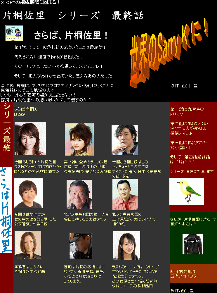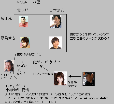 同時刻、拉致被害から、開放され祖国に戻った加賀智美さんが、小池総理に、外務大臣に任命され、最後の魂の浄化の、行為に出でる。この3つ場面が韓国、さいしゅう島でクロスする。